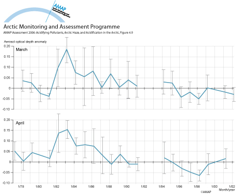 Monthly averaged aerosol optical depth anomalies at Barrow (Alaska) for March and April. The anomalies are relative to a base of non-volcanic years. Data from 1992 and 1993 were removed due to stratospheric aerosol influx from the Pinatubo eruption in 1991. Vertical lines represent 1 standard deviation of the monthly mean