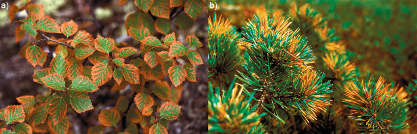 Visible (acute) SO2 injuries on (a) birch (Betula pubescens) leaves and (b) Scots pine (Pinus sylvestris) needles at Svanvik, Norway, approximately 10 km northwest of Nikel