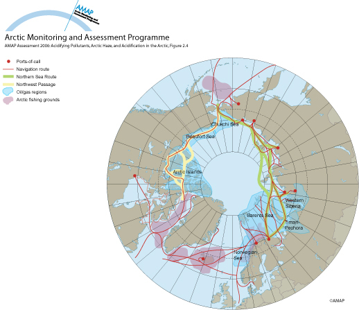 Shipping routes, oil and gas regions, and fishing grounds in the Arctic