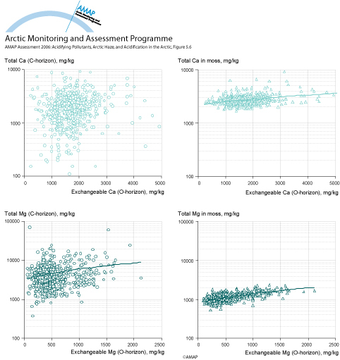 Ammonium acetate extractable Ca and Mg in the O-horizon of soils (x-axis) vs. their total concentrations (aqua regia extractable) in the C-horizon of soils and in moss in 1995