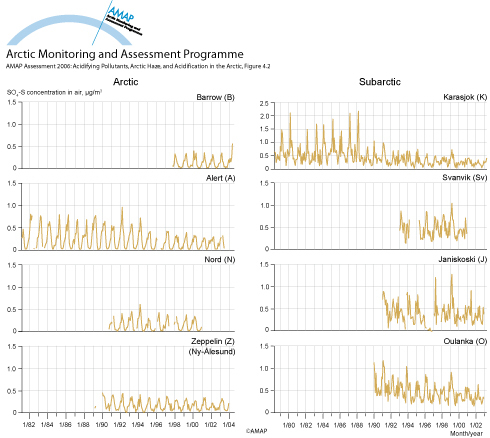 Data made available for Alert by the Canadian National Atmospheric Chemistry (NAtChem) Database and Analysis System, for Barrow by NOAA PMEL (http://saga.pmel.noaa. gov/data/), and for the other stations by EMEP (http://www.emep.int/)
