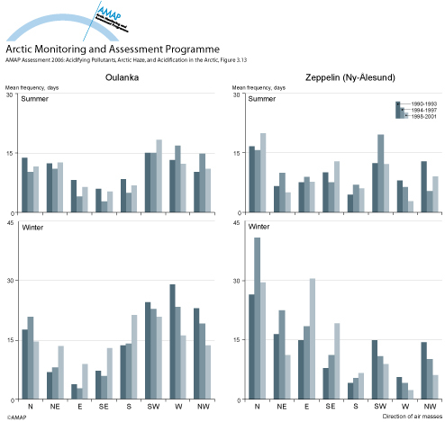 Frequency and variation in the direction of air masses arriving at Oulanka and Zeppelin over 4-year periods during the 1990s