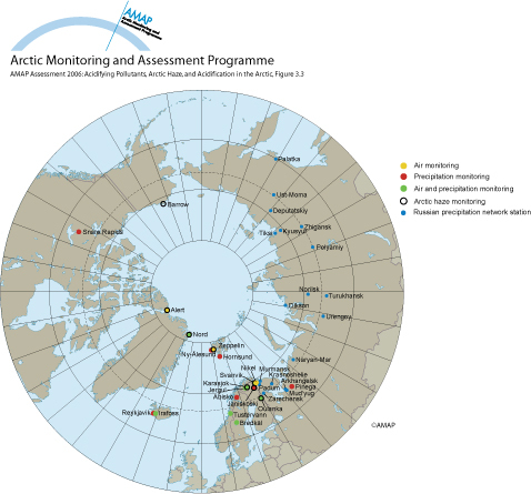 Locations of background monitoring stations for air and precipitation chemistry, and arctic haze and the Russian precipitation chemistry stations