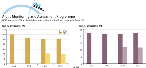 Projected total emissions of SOx-S and NOx-N between 1990 and 2020