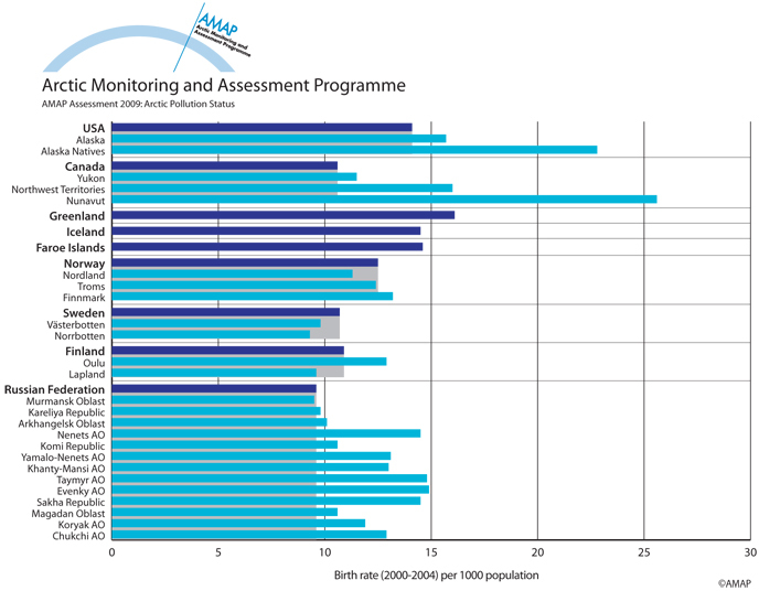 Birth rate in Arctic countries and regions (2000-2004) per 1000 population