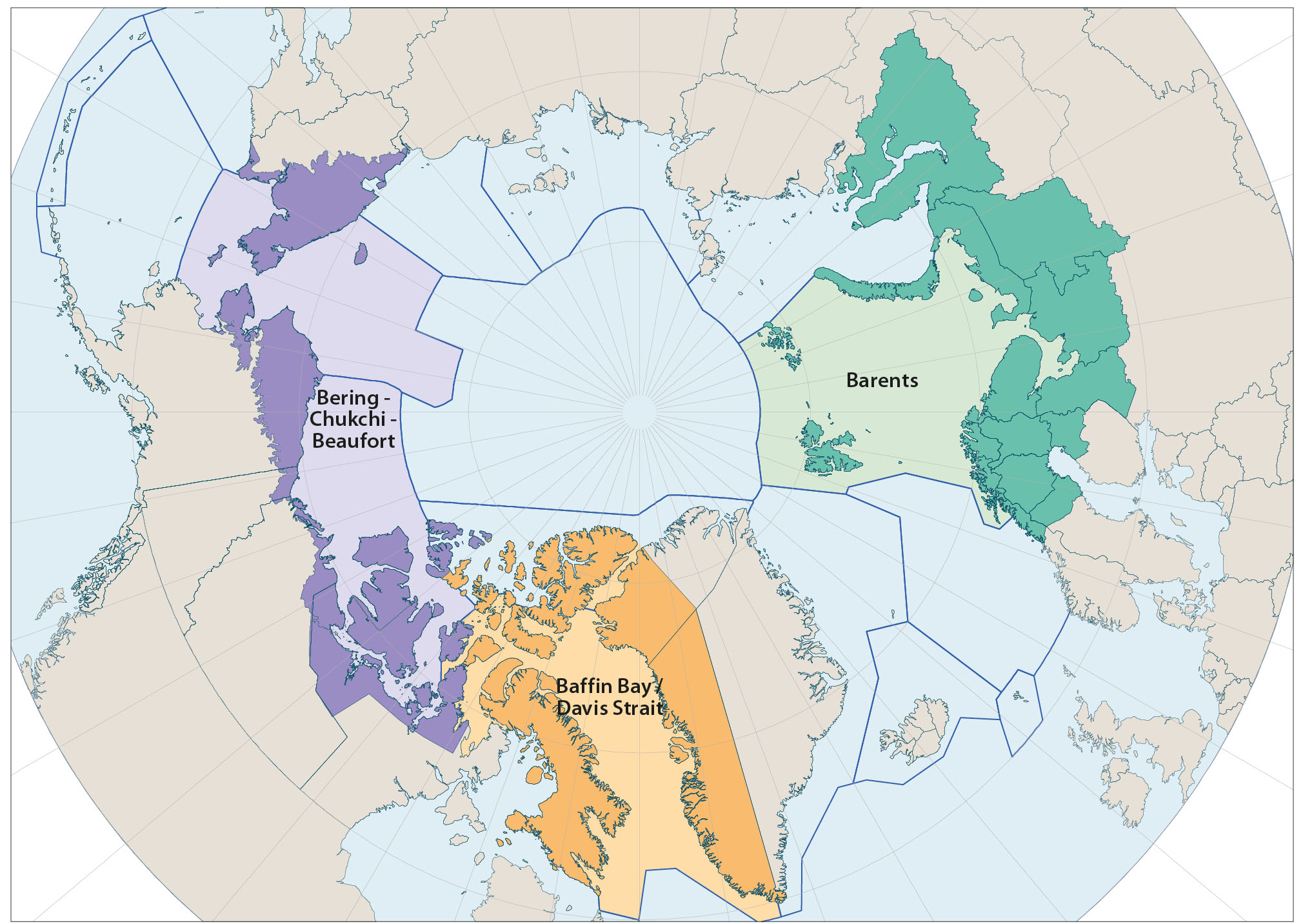 Figure 1.1 The three regions for the project Adaptation Actions for a Changing Arctic. Blue lines delimit Large Marine Ecosystems (LMEs).