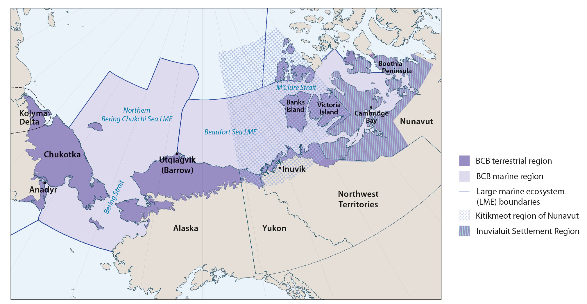Figure 1.2 The Bering-Chukchi-Beaufort region. The southern terrestrial boundary of the BCB region generally follows the treeline–tundra boundary, while the marine boundaries conform to the boundaries of the large marine ecosystem (LME) areas defined by PAME (Skjoldal and Mundy, 2013).