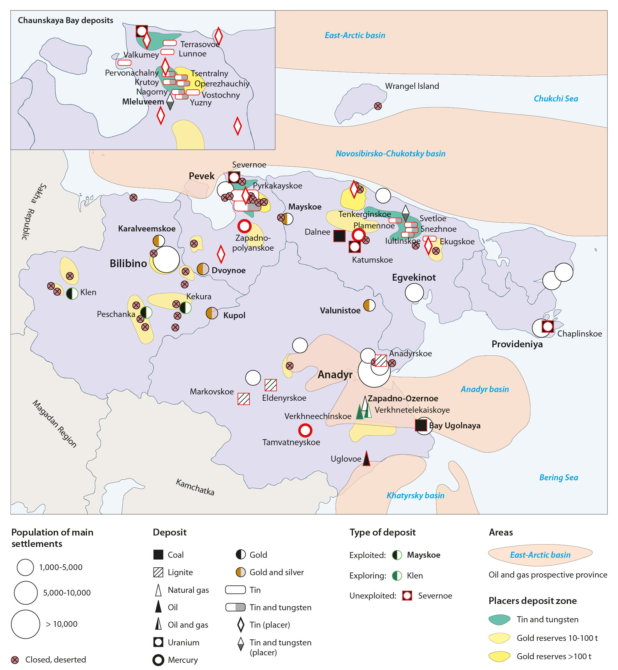 Figure 3.9 Minerals of the Chukotka district (Federal Agency of Geodesy and Cartography, 2005, 2008; Mineral Information and Analysis Center, 2015).