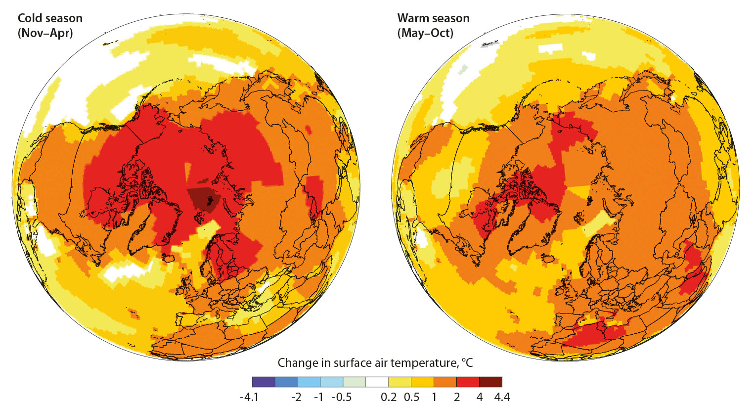 Figure 4.1 Historical trends in surface air temperature. Graphic shows the spatial pattern of Arctic warming for the period 1961–2014 in the cold season and warm season. Warm colors indicate warming trends and cool colors indicate cooling trends (NASA GISTEMP http://data.giss.nasa.gov/gistemp/maps/).