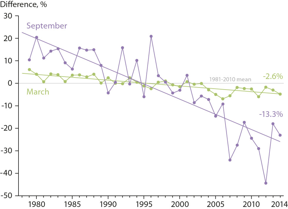 Figure 4.2 Historical trends in Arctic sea ice extent. Graphic shows anomalies in sea ice extent for March (month of maximum extent) and September (month of minimum extent). The anomaly value for each year is the difference in ice extent relative to the mean values for 1981–2010. The straight lines show least squares linear regressions and indicate ice losses of 2.6% (March) and 13.3% (September) per decade (Perovich et al., 2015).