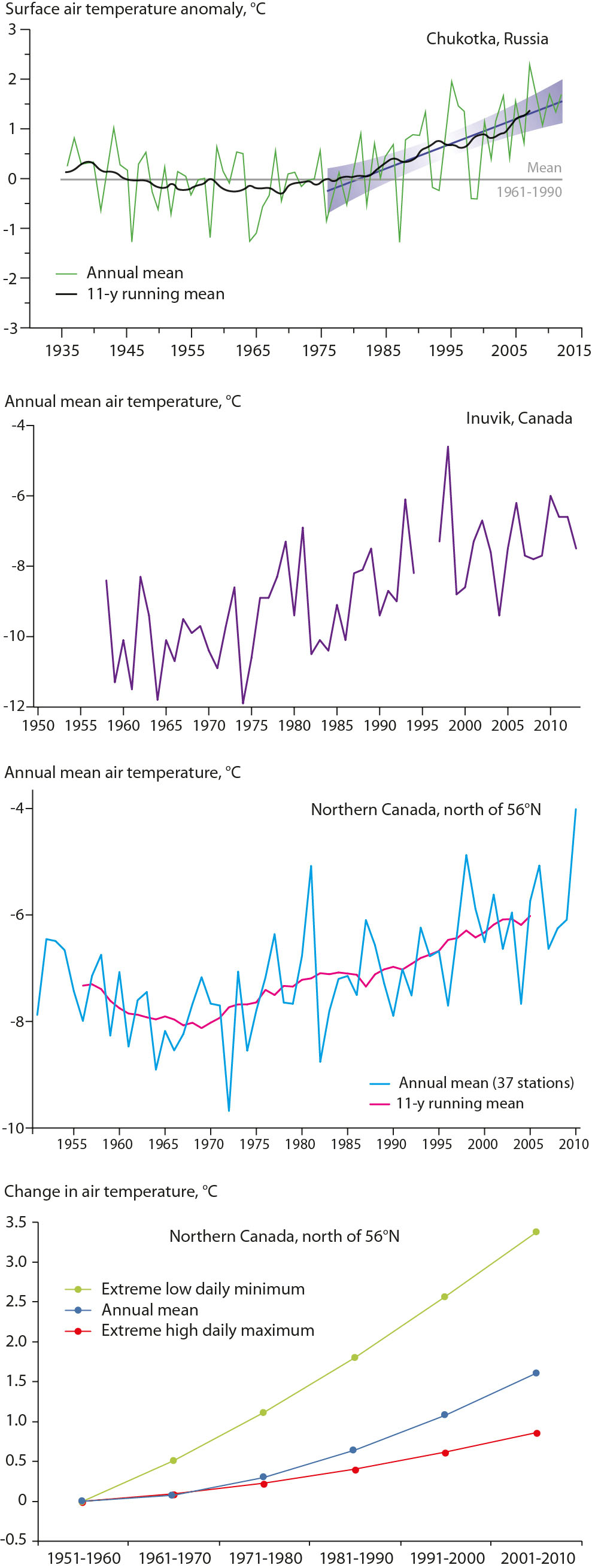Figure 4.5 Historical trends in air temperature in the BCB region. Plots show spatially-averaged annual mean surface air temperature anomalies for the Chukotka region (based on RosHydromet, 2014); annual mean air temperature at Inuvik (from Environment Canada’s Adjusted and Homogenized Climate Data and based on Vincent et al., 2012); annual mean air temperature averaged across northern Canada (based on Wang et al., 2013); and change in regional average (relative to 1951-1960) of the 20-year return values of extreme high daily maximum temperature and extreme low daily minimum temperature and the annual mean temperature (Wang et al., 2013). Return values represent the level that is attained, on average only once in 20 years.