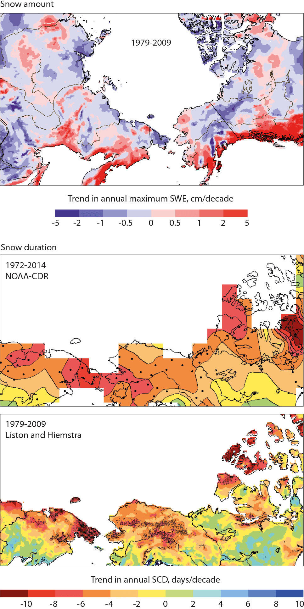 Figure 4.6 Historical trends in snow amount and duration in the BCB region. Plots show trends in annual maximum snow water equivalent (SWE) for the period 1979–2009, as estimated from the snow cover reconstruction of Liston and Hiemstra (2011), and trends in annual snow cover duration, as estimated from the NOAA CDR satellite record (Robinson et al., 2012) and the Liston and Hiemstra (2011) reconstruction.