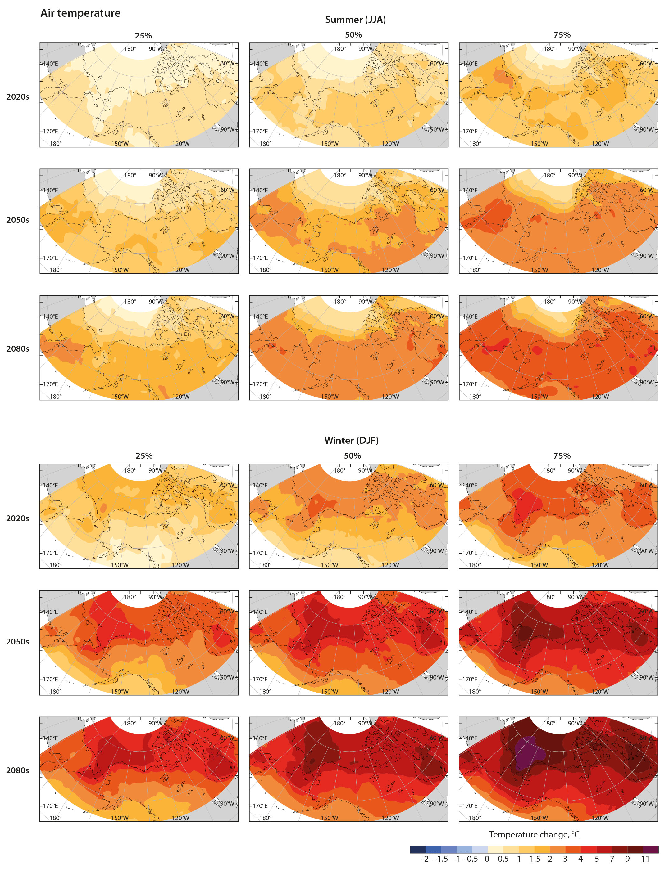Figure 4.10 CMIP5 multi-model ensemble projections of future change in surface air temperature (relative to the 1986–2005 average) for summer and winter, based on the RCP4.5 scenario. Results are shown for three future periods: 2016–2035 (‘2020s’), 2046–2065 (‘2050s’) and 2081–2100 (‘2080s’). Panels illustrate the 25th, 50th, and 75th percentiles of change as projected by the 29 CMIP5 models listed in Table 4.1. Graphic based on re-gridded CMIP5 data available at ccds-dscc.ec.gc.ca
