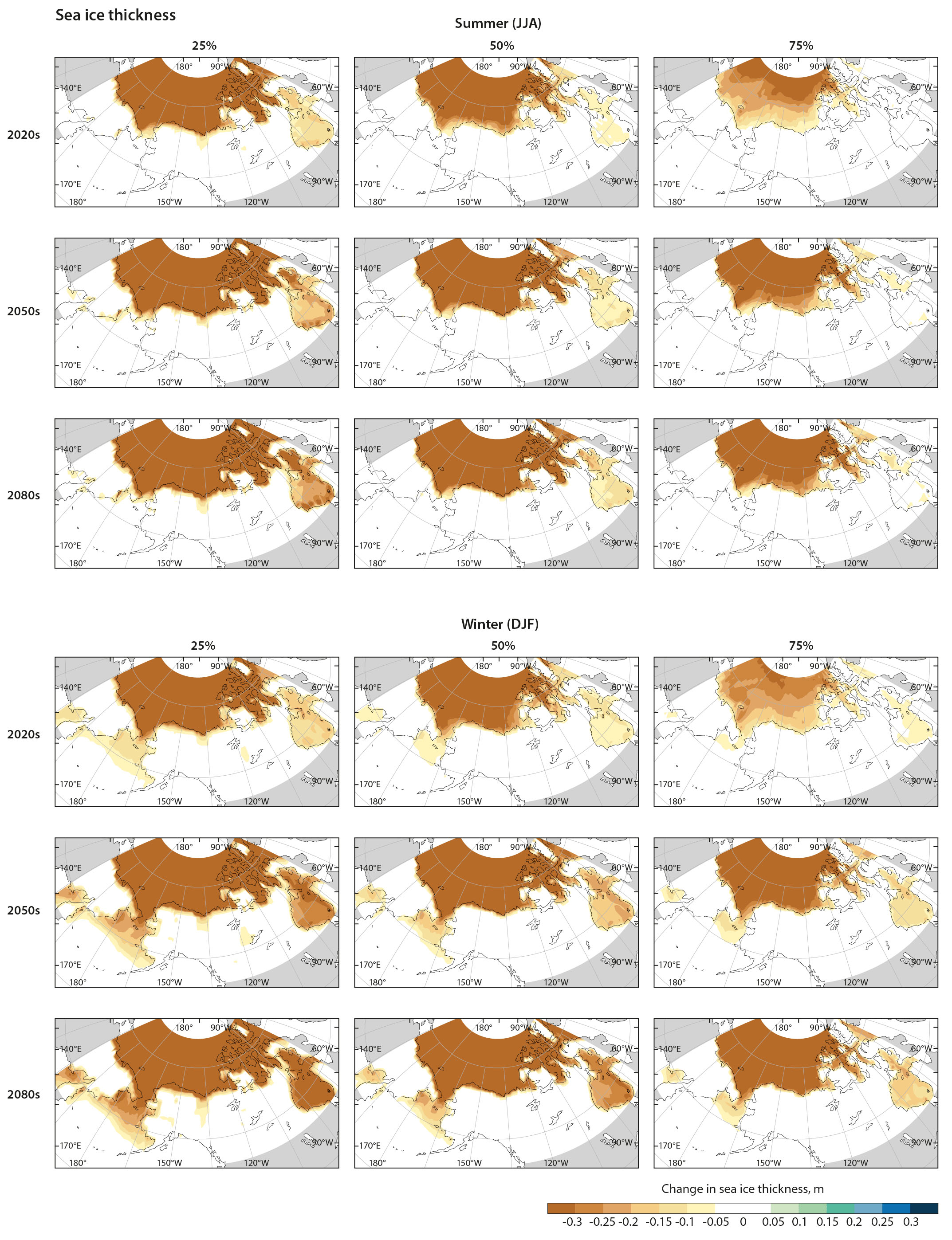 Figure 4.12 CMIP5 multi-model ensemble projections of change in sea ice thickness (relative to the 1986–2005 average) for summer and winter, based on the RCP4.5 scenario. Results are shown for three future periods: 2016–2035 (‘2020s’), 2046–2065 (‘2050s’) and 2081–2100 (‘2080s’). Panels illustrate the 25th, 50th, and 75th percentiles of change as projected by the 29 CMIP5 models listed in Table 4.1. Graphic based on re-gridded CMIP5 data available at ccds-dscc.ec.gc.ca