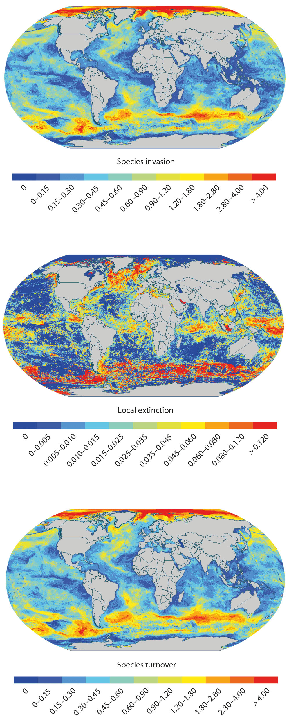 Figure 4.17 Biodiversity-related changes projected to result from projected high-range warming as of 2050 (relative to 2001–2005 means). Plots show species invasion intensity, local extinction intensity, and species turnover. Species redistribution models using ESM output and current species distributions based on selected environmental variables (temperature, salinity, oxygen) to project future change indicate the Arctic could become a hotspot for species invasions and species turnover (i.e., extinction of local species and replacement by invading species) (Cheung et al., 2009).