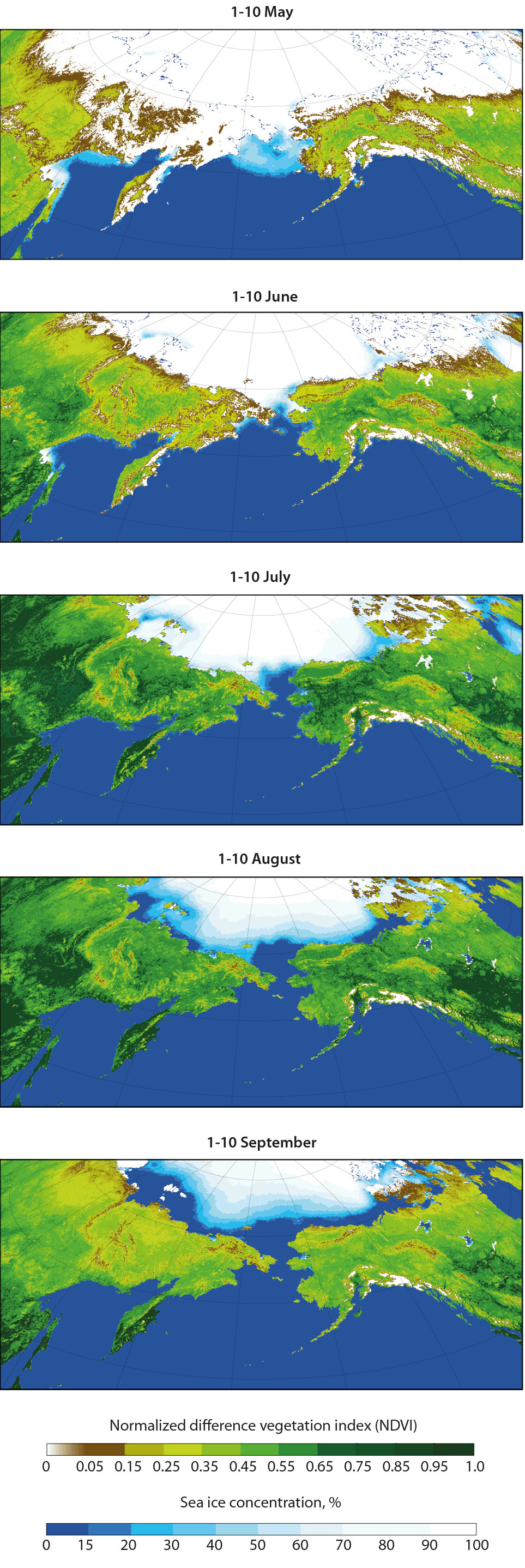 Figure 4.18 Mean seasonal changes in vegetation phenology as indicated by NDVI-derived indices, 1982–2010, for May through September (David Douglas, US Geological Survey, Alaska Science Center).