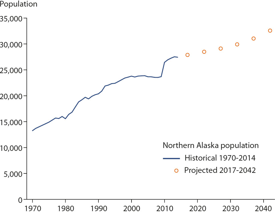 Figure 4.19 Change in population over recent decades in northern Alaska, plus projections to 2042 (based on ADL 2014 and Hamilton et al., 2016).