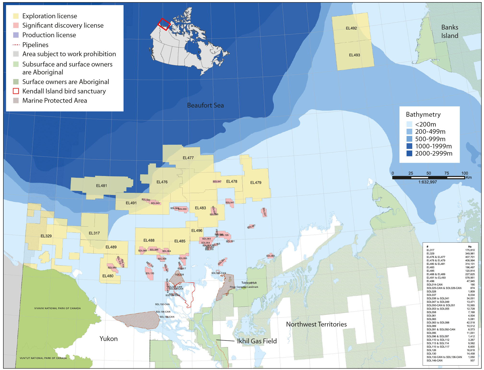 Figure 4.23 Exploration licenses and significant discovery areas in the Canadian Beaufort Sea as of November 2012 (based on BREA, 2013).