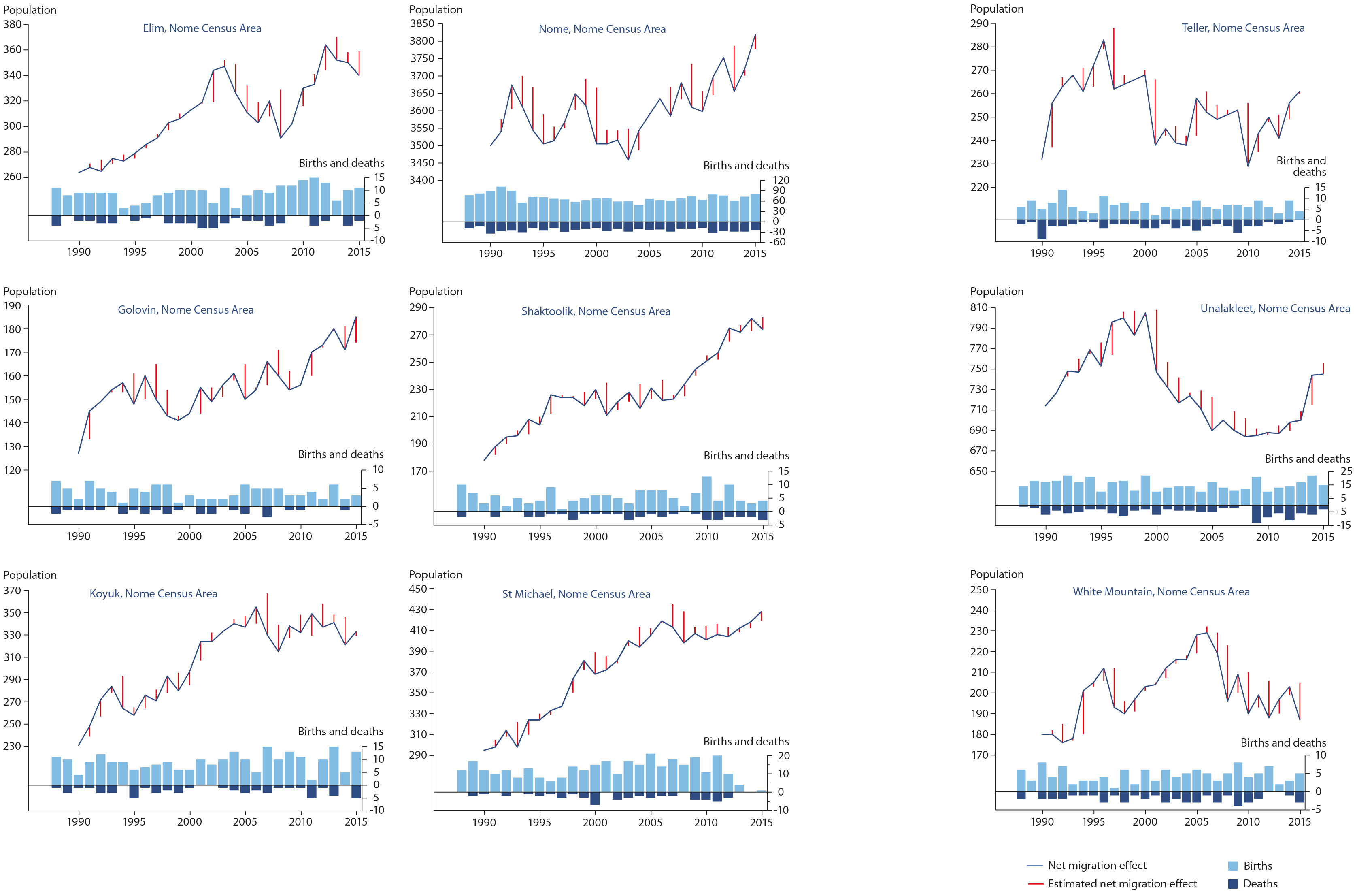 Figure 6.4 Population dynamics of nine communities along Alaska’s Norton Sound, where king salmon fisheries collapsed in 2000 (population and birth/death numbers are graphed from different baselines but with comparable y-axis scales) (Hamilton et al., 2014).
