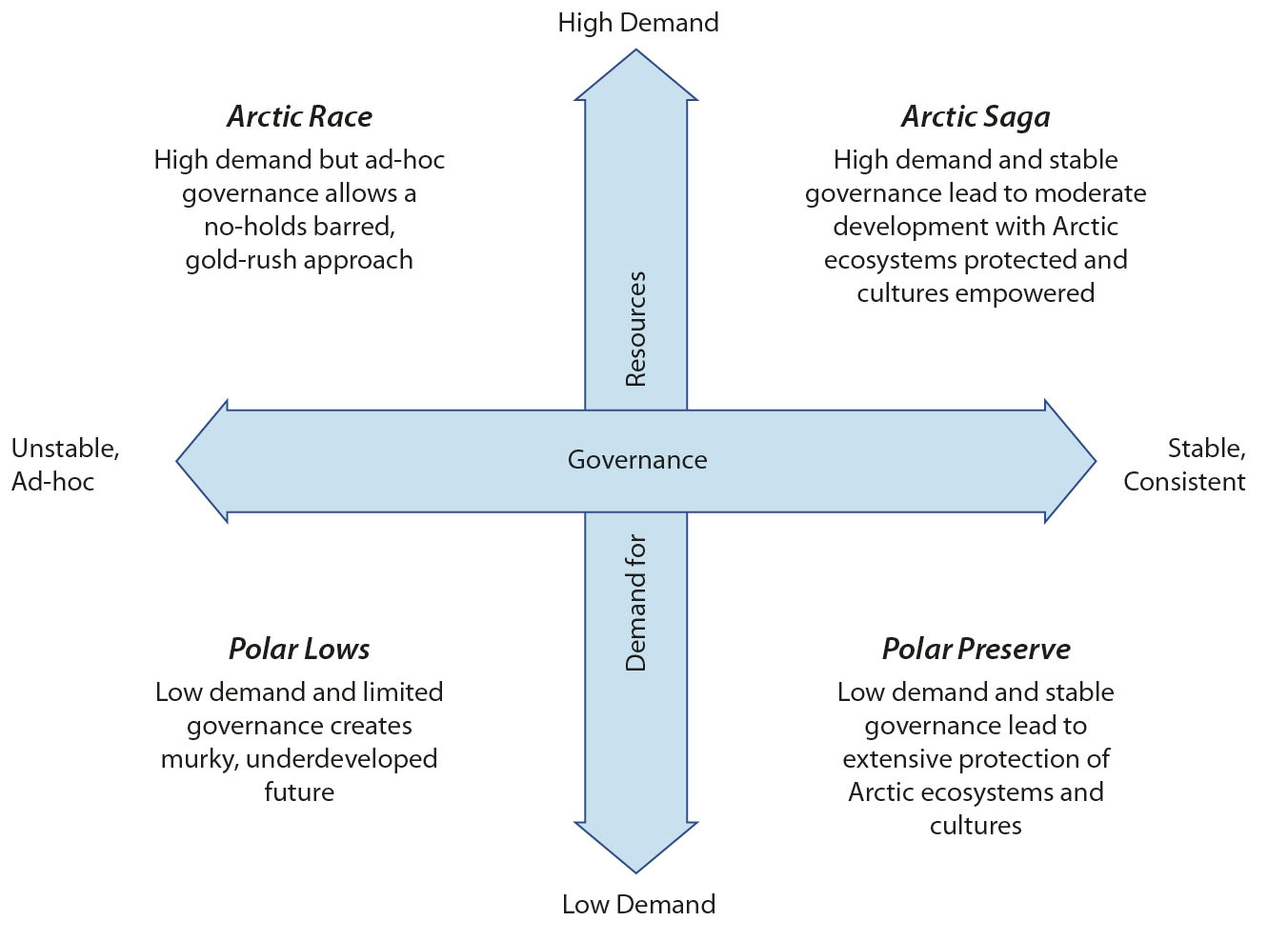 Figure 6.6 Four scenarios for the future of the Arctic, based on future demand for Arctic resources and the stability of Arctic governance (based on work by Brigham and colleagues: Brigham, 2008, and PAME, 2009). These scenarios are ‘Arctic Race’, in which ad hoc and poorly developed governance does not keep up with the high demand for Arctic resources, resulting in a gold-rush approach; ‘Arctic Saga’, in which high demand is tempered by stable governance structures, leading to development balanced with the needs of local peoples and ecosystems; ‘Polar Lows’, in which demand does not materialize and limited governance leads to little change or development for the region; and ‘Polar Preserve’, in which stable governance pursues extensive protection of Arctic ecosystems and peoples without external geopolitical pressure.