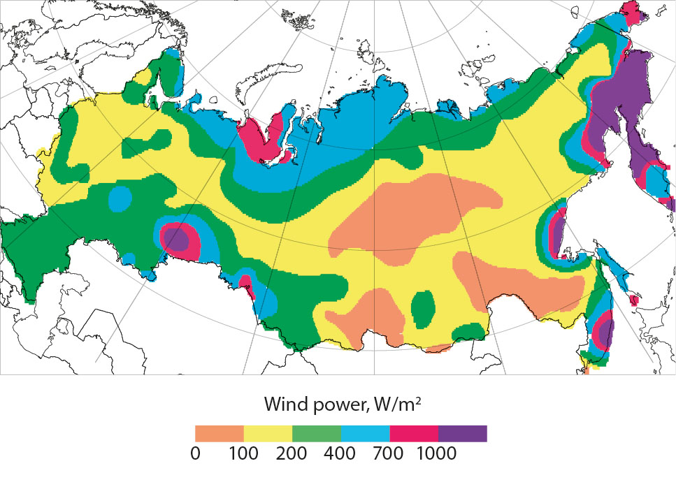 Figure 5.6 Zoning of the Russian territory according to specific power of the wind flow at a height of 100 m above the ground (Roshydromet, 2014).