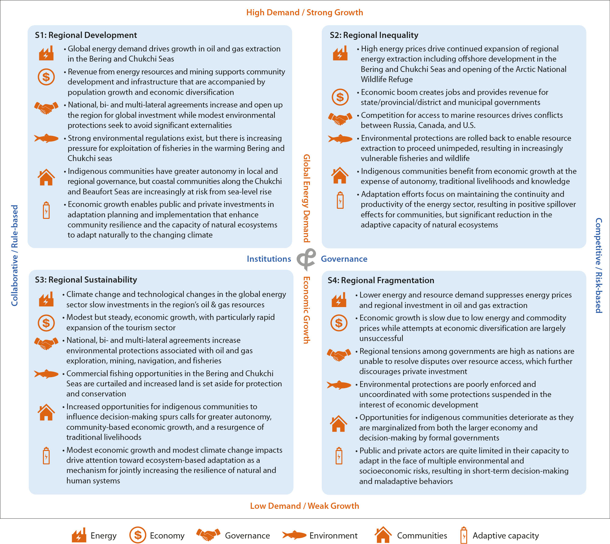 Figure 8.1 Summary of socio-economic scenarios for the BCB region, based on a synthesis of prior scenario activities from the region.