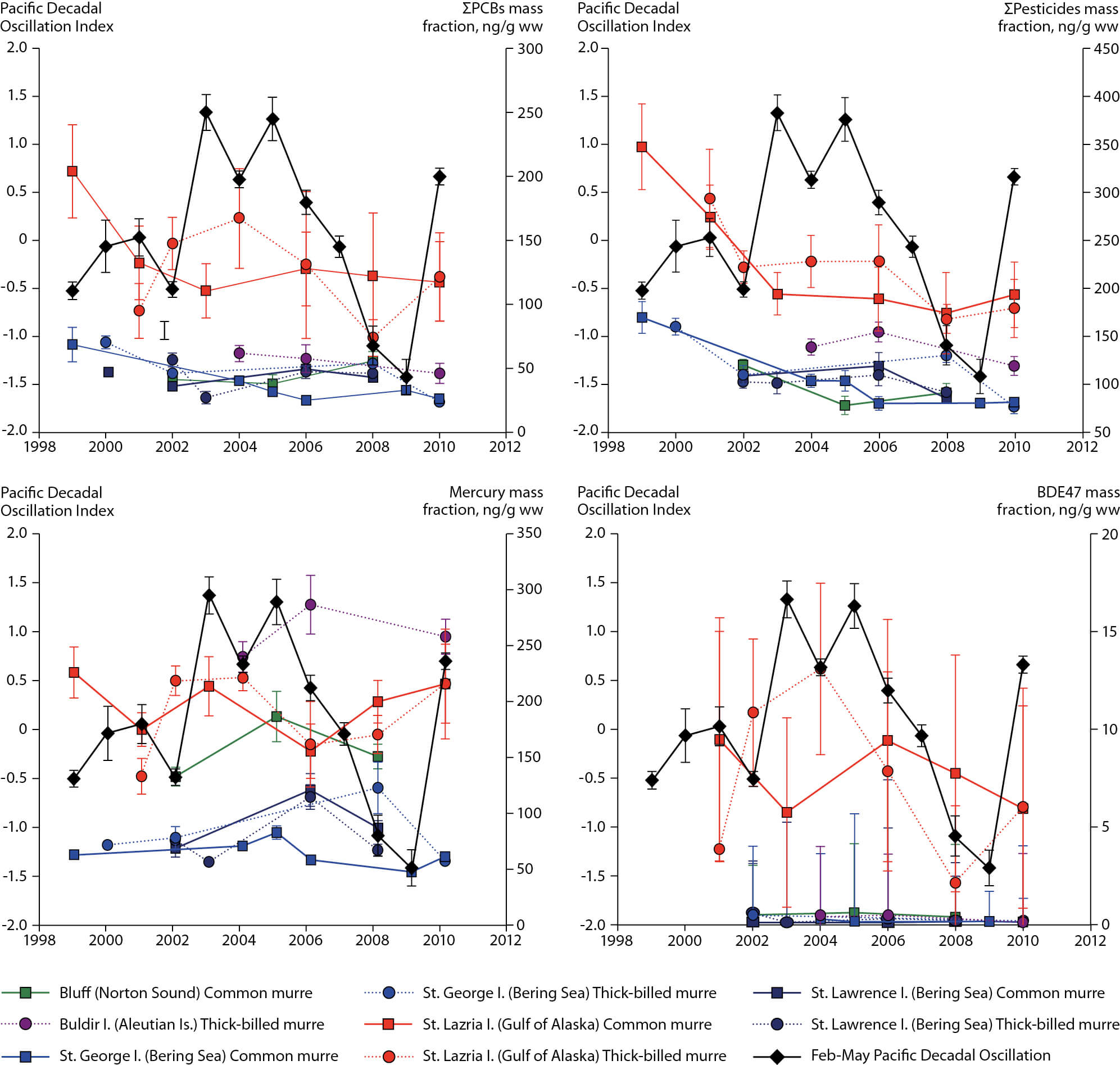 Figure A4.2 Mean concentrations (and standard errors) for a range of contaminants in Alaskan murre (Uria spp.) eggs compared to the February–May Pacific Decadal Oscillation.