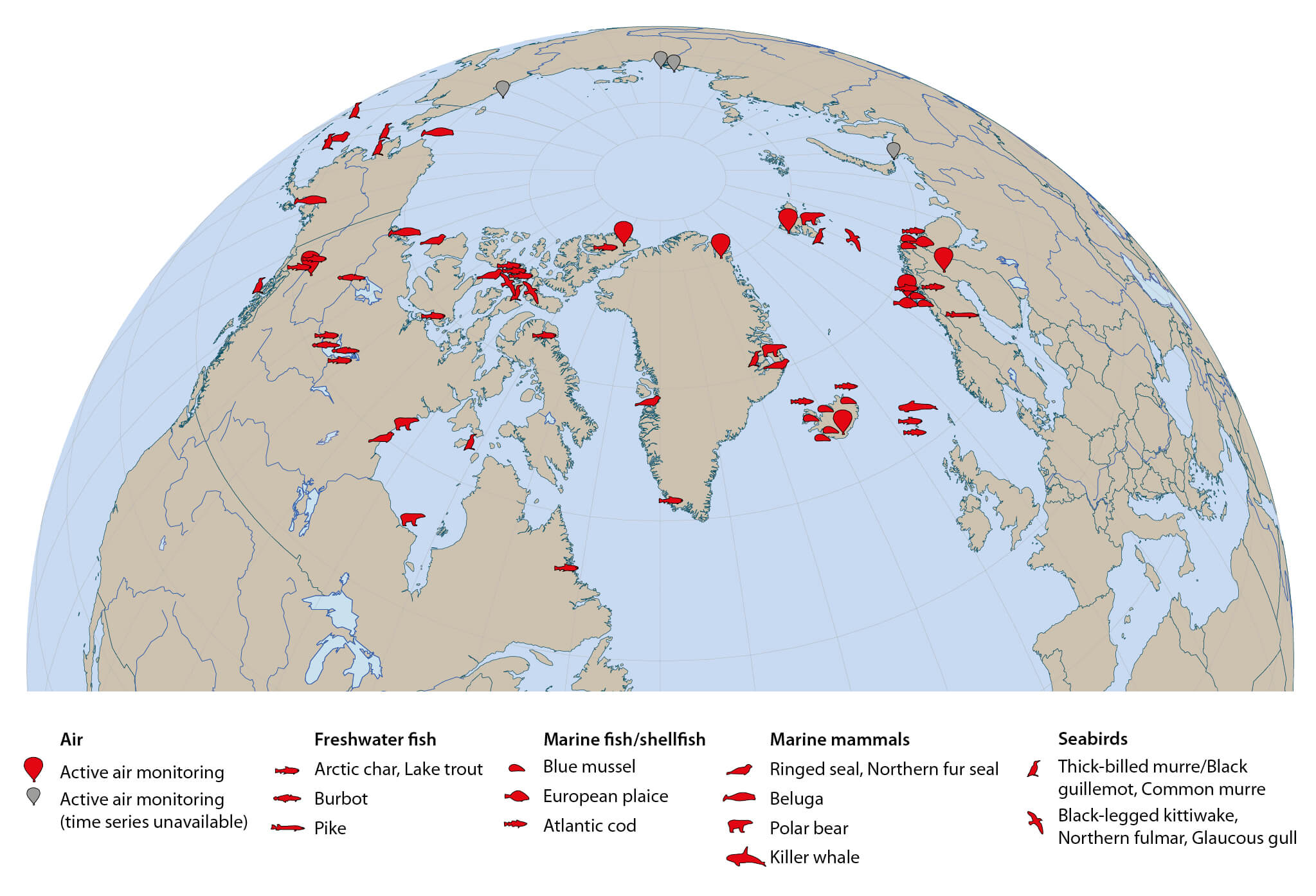 Figure 2.1 Locations where long time-series monitoring of POPs in Arctic air and biota are conducted. For biota, the species monitored are also indicated.