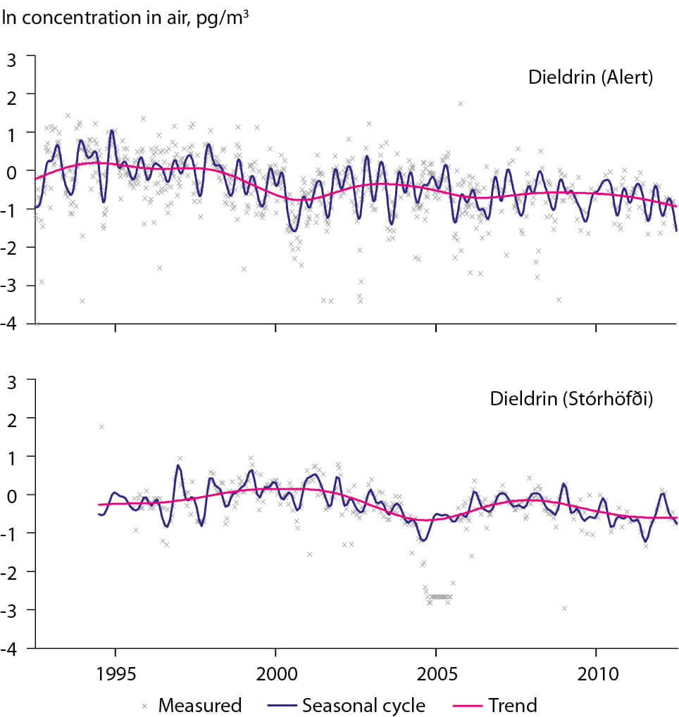 Figure 4.2 Trends in air concentration of dieldrin at Alert (Canada) and Stórhöfði (Iceland).