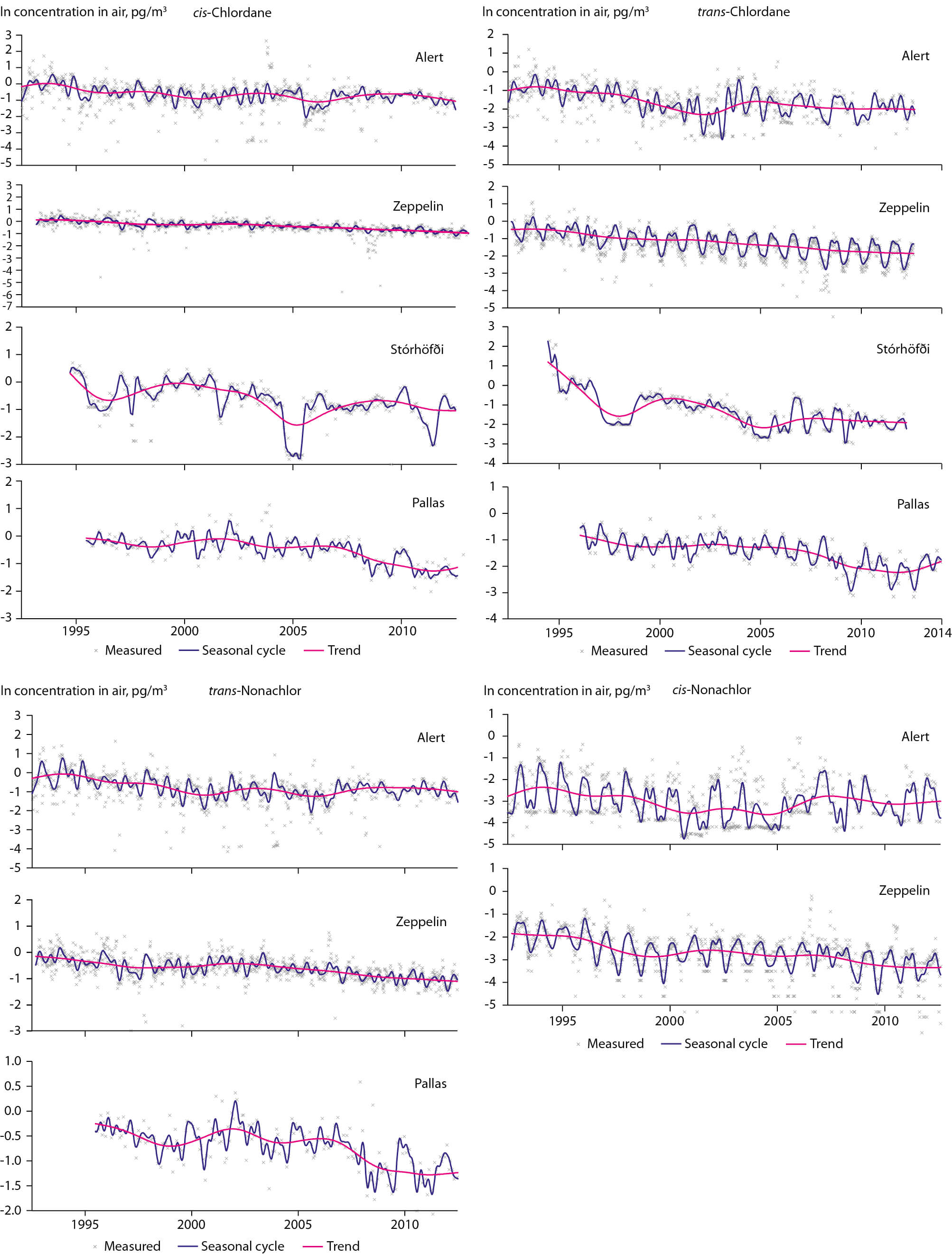 Figure 4.4 Trends in air concentration of chlordanes and nonachlors (see next page) at Arctic air monitoring sites.