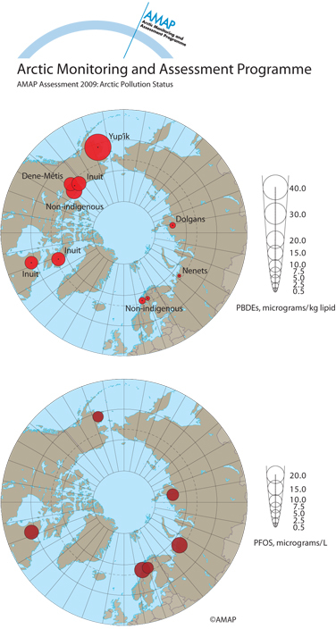 PBDEs (sum of BDE-47, -99, -100 and -153) and PFOS in blood plasma (Alaska: serum) of mothers and women of child-bearing age