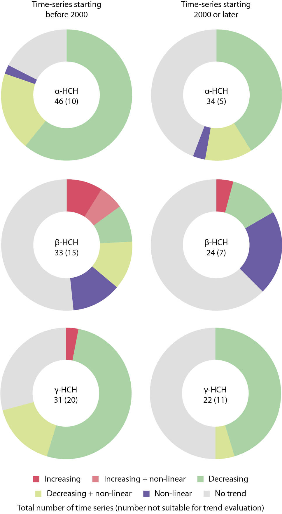 Figure 4.21 Overview of trend results for α-HCH, β-HCH and γ-HCH in biota for time-series starting before and after 2000.