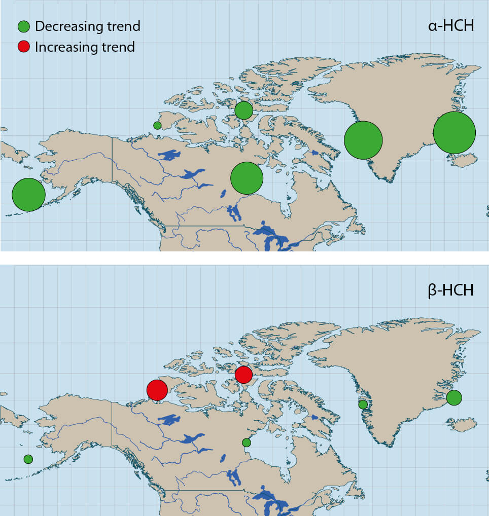 Figure 4.23 Annual decrease and annual increase in α-HCH and β-HCH in seal populations by longitude and latitude. The size of the circle represents the magnitude of the annual change.