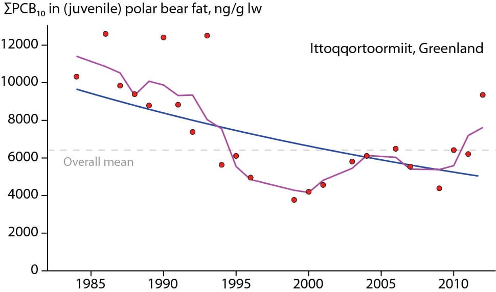 Figure 4.26 Trends in ΣPCB10 in juvenile polar bears from eastern Greenland.