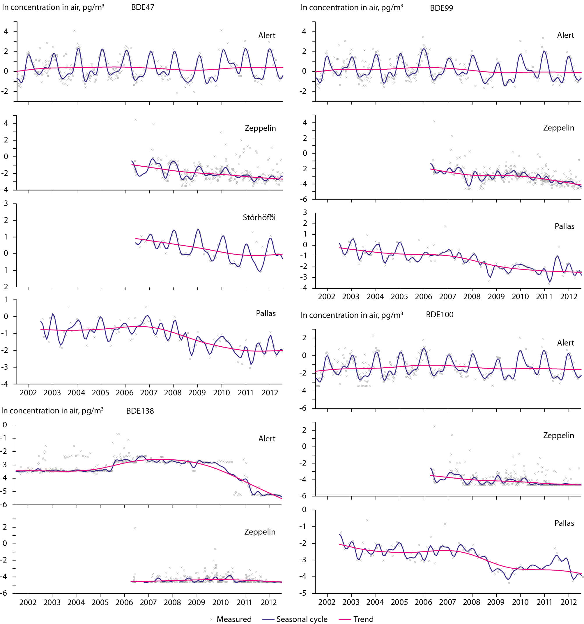 Figure 4.32 Trends in air concentration of PBDEs at Arctic air monitoring sites.