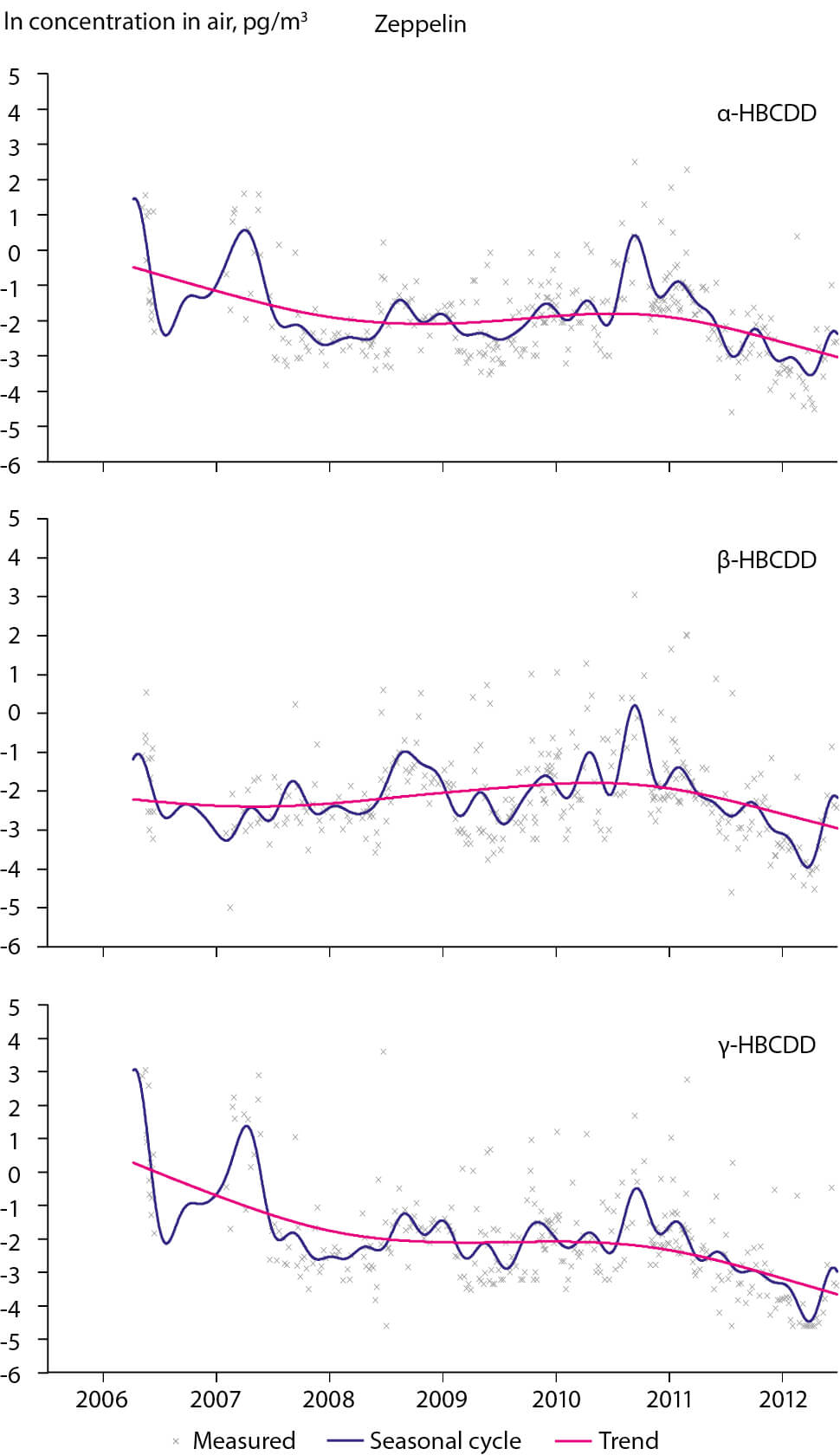 Figure 4.34 Trends in air concentration of HBCDDs at Zeppelin (Svalbard).