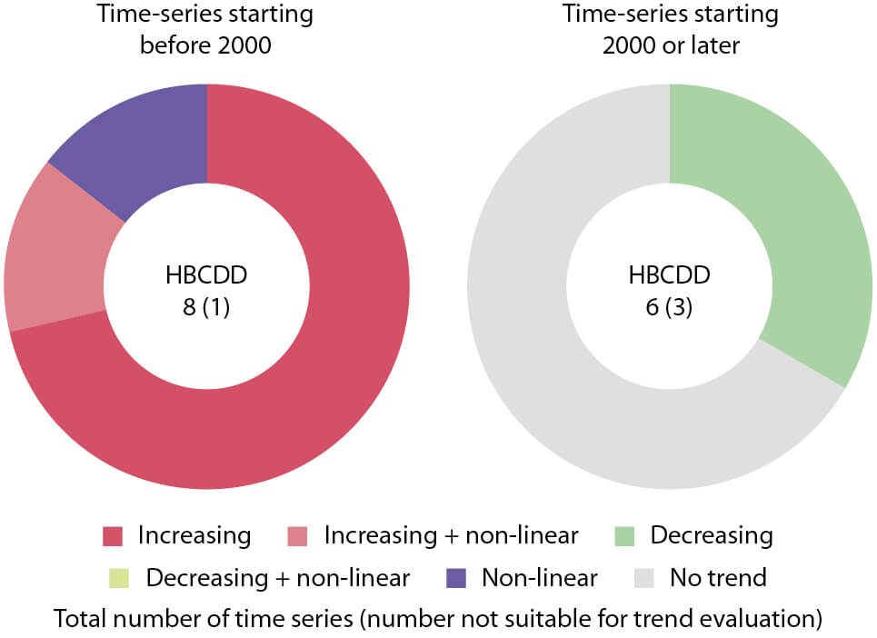 Figure 4.36 Overview of trend results for HBCDD time-series starting before and after 2000.