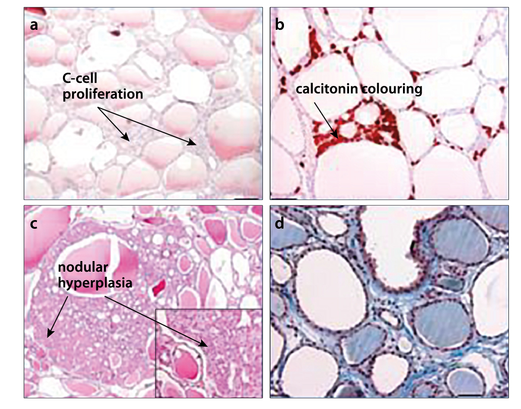 Figure 3.3 Thyroid lesions in East Greenland polar bears sampled during 1999–2009. (a) C-cell proliferations, (b) calcitonin colouring, (c) nodular hyperplasia, (d) interstitial fibrosis (modified from Sonne et al., 2011).