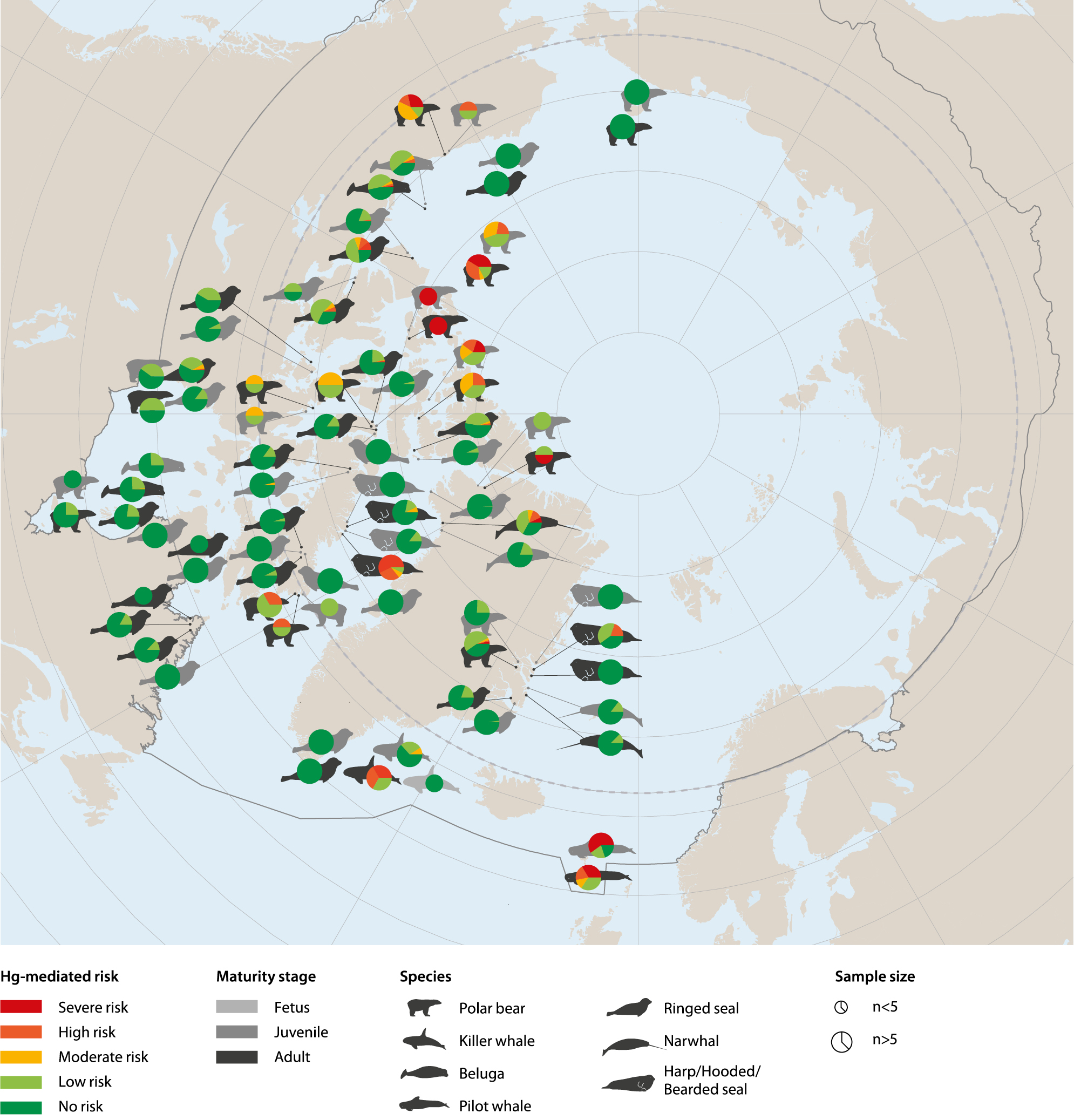 Figure 4.3 Geographical overview of the proportion of individuals of specific Arctic marine mammal populations that are at risk of Hg-mediated health effects; based on post-2000 monitoring data grouped according to maturity where possible. The five risk categories are defined using effect threshold categories observed for harp seals (Ronald et al., 1977). See Annex 3 for the detailed information upon which this summary graphic is based.