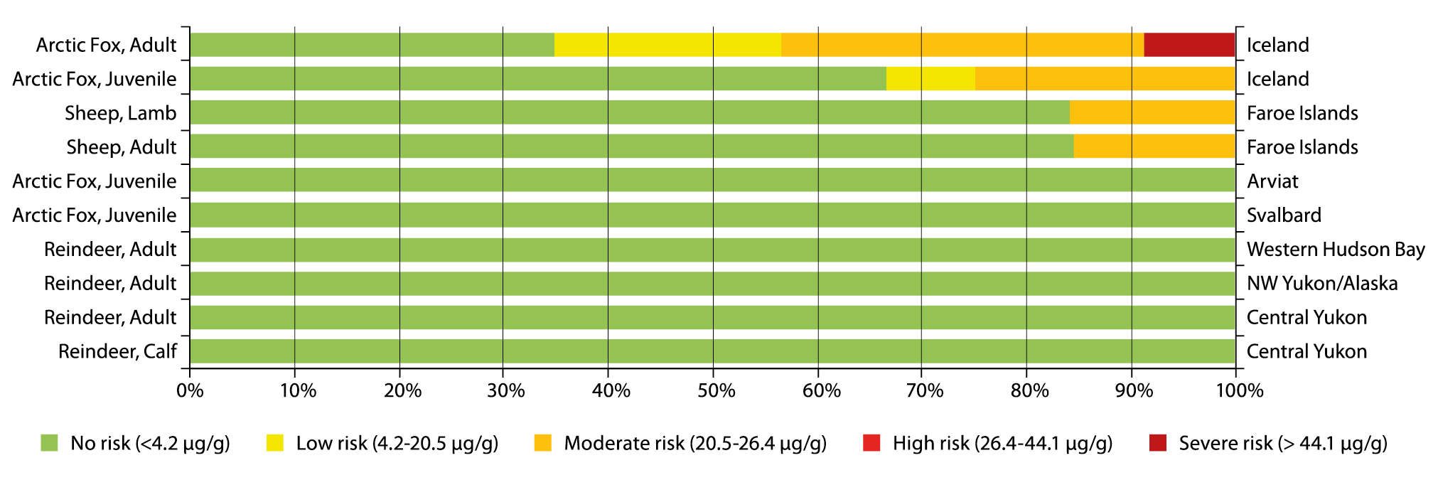 Figure 4.5 Ranked overview (from highest to lowest risk) of the proportion of individuals, where possible grouped according to maturity, of specific Arctic terrestrial mammal populations that are at risk of total Hg-mediated health effects. Following 2000–2015 hepatic concentrations, five risk categories are reported based upon effect threshold categories observed for mink (Wobeser et al., 1976; Wren et al., 1987).