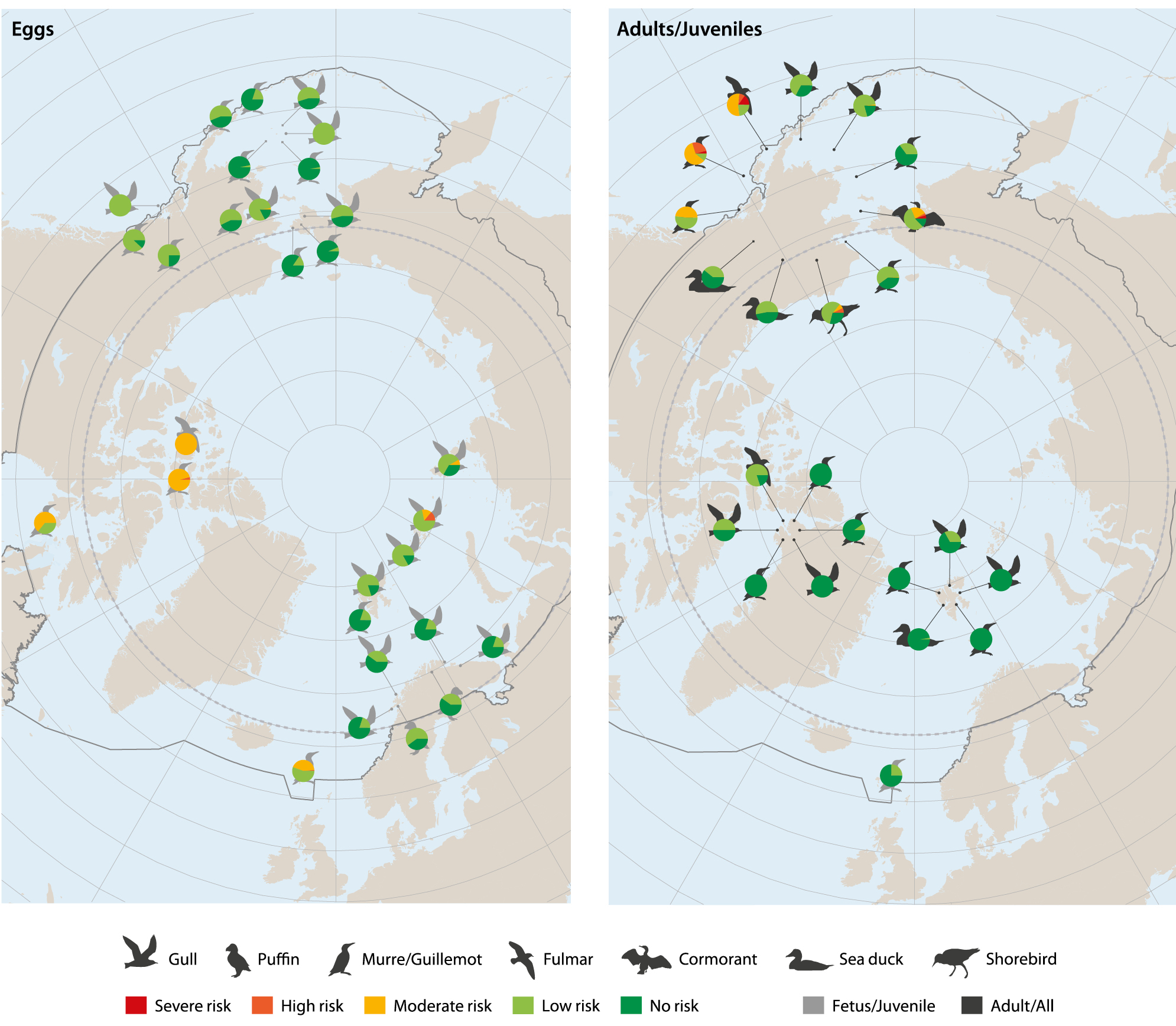 Figure 4.6 Geographical overview of the proportion of individuals of specific Arctic marine bird populations that are at risk of total-Hg mediated health effects; based on post-2000 monitoring data grouped according to maturity where possible. Results based on bird egg monitoring data and results from monitoring of adult/juvenile birds. The five risk categories are defined using effect threshold categories for North American bird species (Ackerman et al., 2016). See Annex 3 for details of datasets, sources and effects category thresholds.