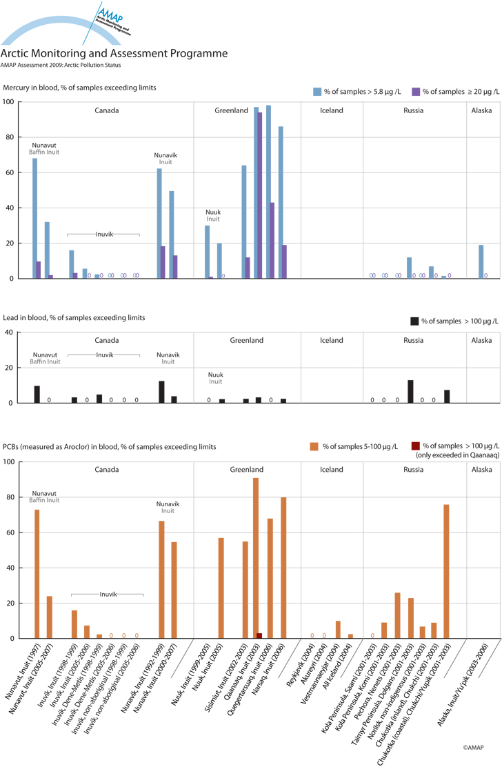 Exceedance of blood guideline values for mercury, lead and PCBs in mothers and women of child-bearing age in different populations in Canada, Greenland, Iceland, Russia and the United States (Alaska)