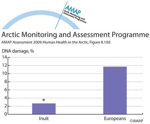 POPs related xenobiotic serum activities in Inuit and combined European study groups (d) sperm DNA damage. * indicates significant difference vs Europeans at p < 0.05.
