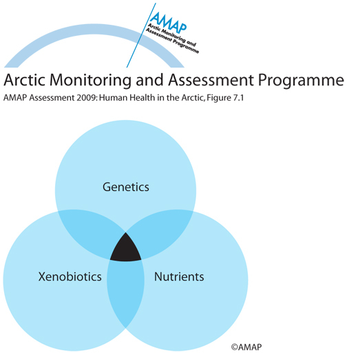 Genes, macronutrients, and contaminants may have synergistic effects on the development of diseases. The probability for illness is increased when several pre-disposing factors are simultaneously present in the same individual