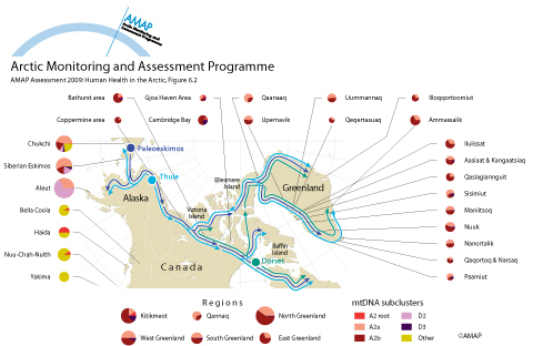North American circumpolar region showing schematically possible source and migration routes of three Arctic cultures and frequency of mtDNA subcluster in Arctic and North American populations.
