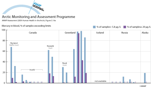 Exceedance of blood guideline values for (total) mercury and lead in mothers and women of child-bearing age in different populations around the Arctic (comparable data were not available from Norway, Sweden and Finland).