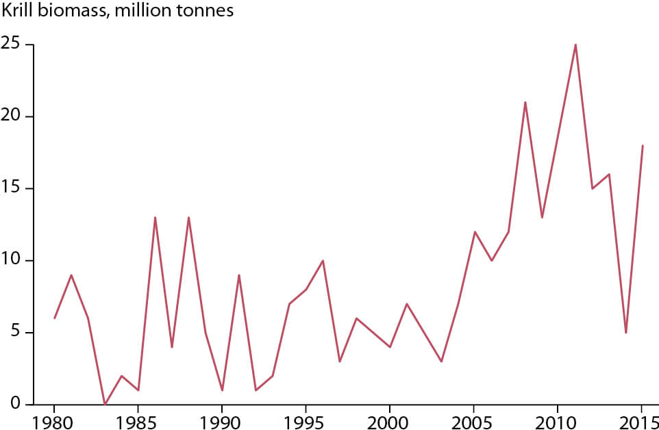 Mean biomass of krill in the Barents Sea 1980-2015