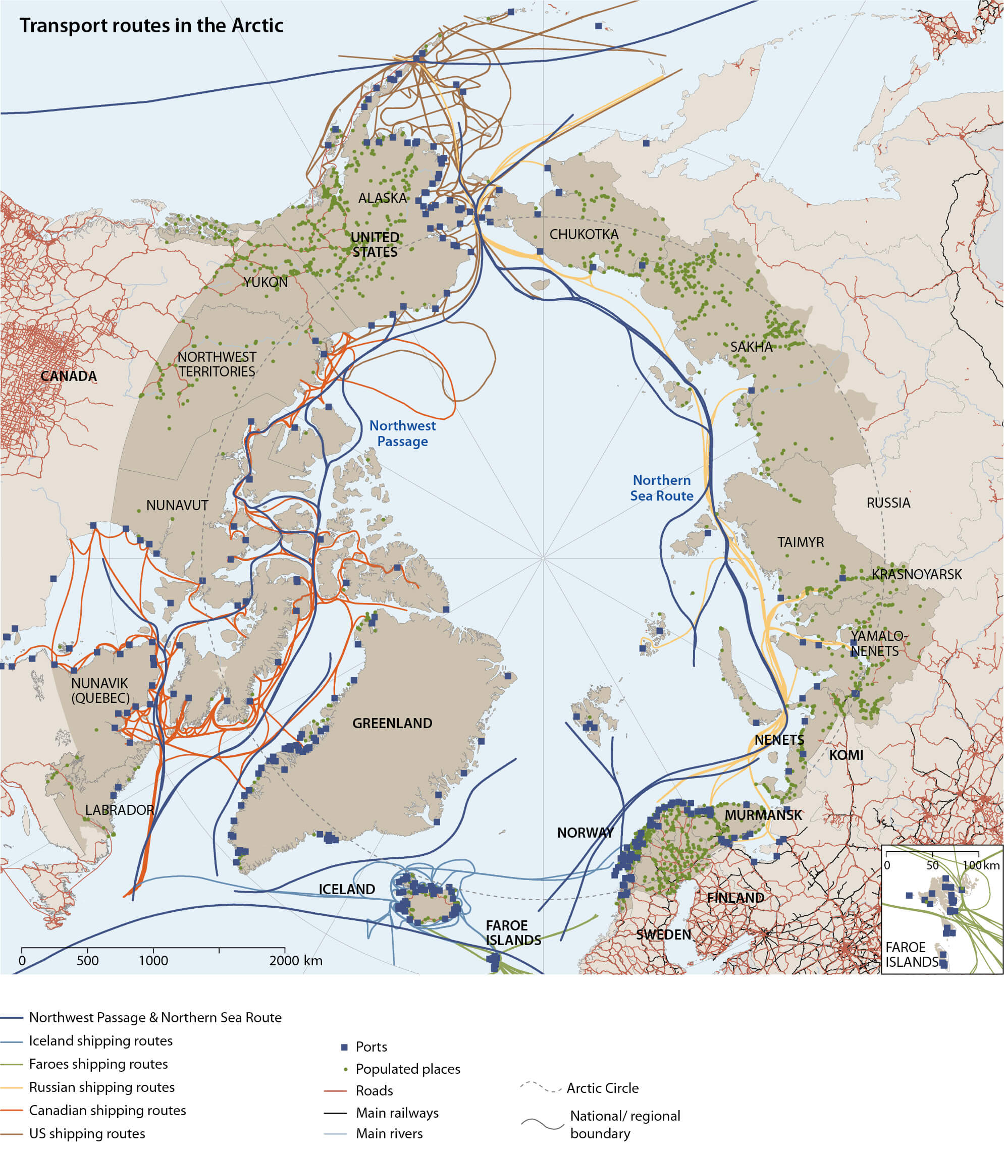 Figure 2.13 At-sea transport routes, major ports and land infrastructure (Nordic Council of Ministers, 2011) (map layout: José Sterling and Julien Grunfelder, Nordregio).