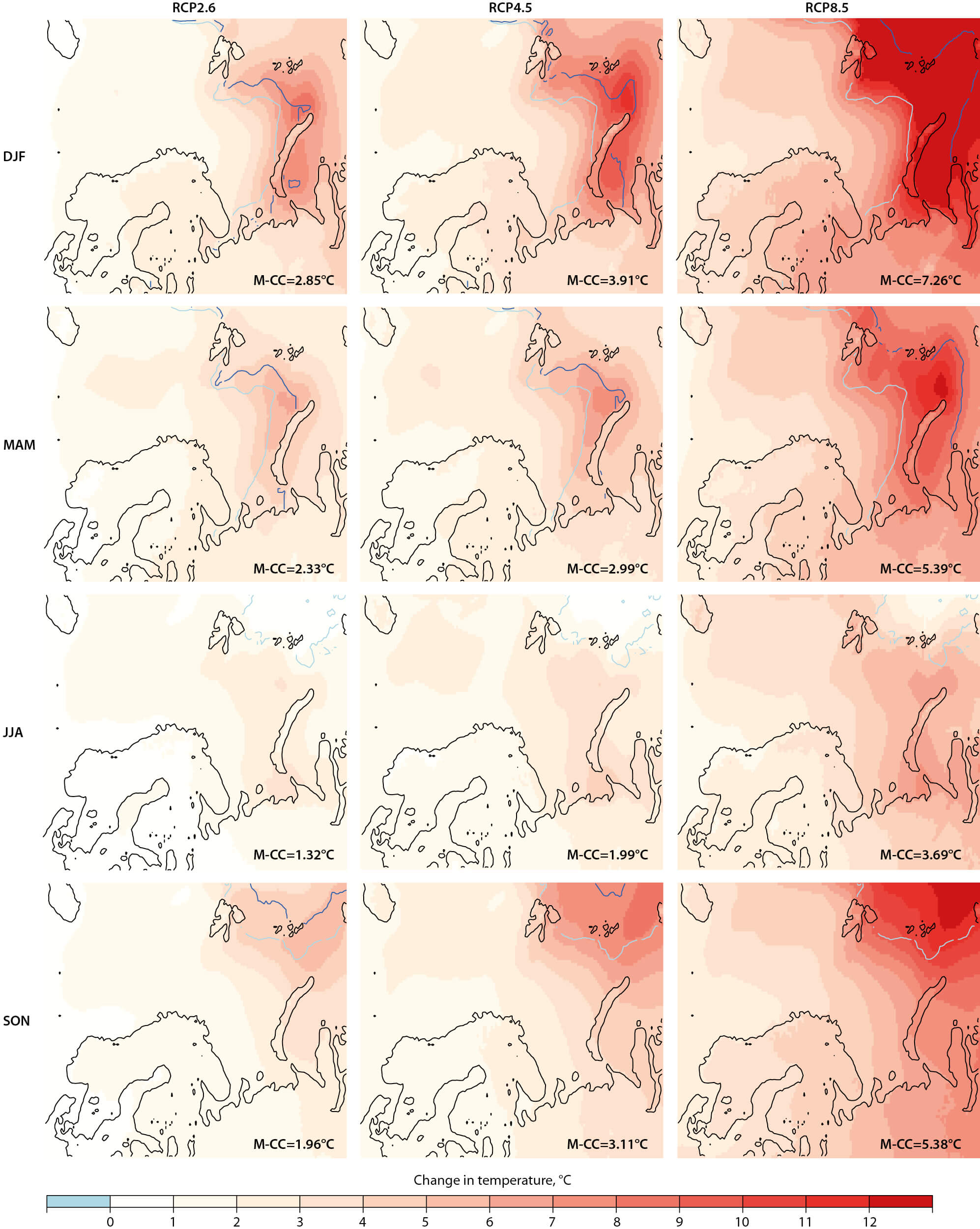 Projected change in seasonal temperature under three emission scenarios using climate models