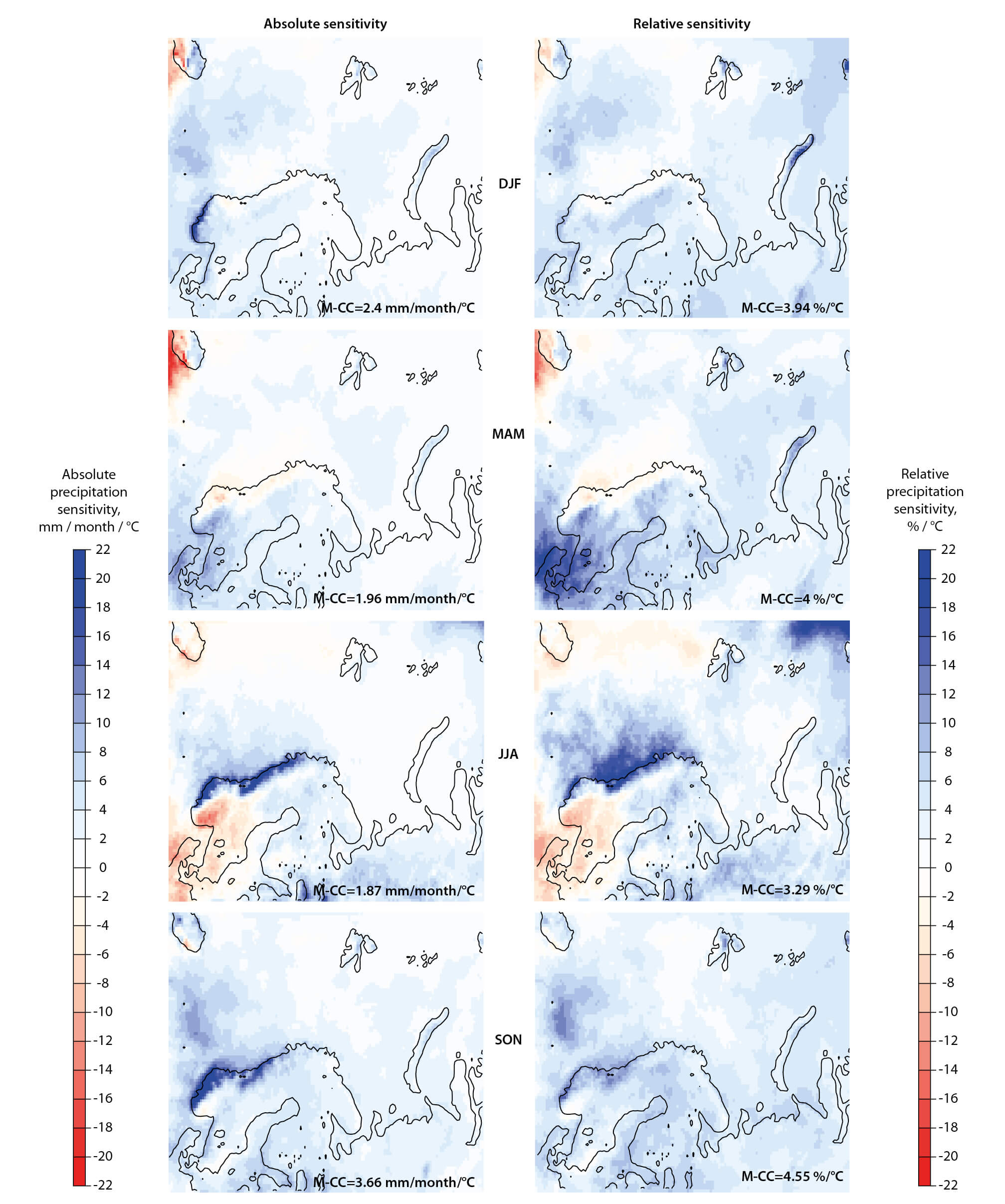 Figure 4.4 Calculated seasonal precipitation sensitivity over the Barents and Scandinavian region using the regional climate model COSMO-CLM driven by the global MPI-ESM-LR Earth System Model. Absolute (left) and relative (right) sensitivities following the RCP8.5 scenario for the period 2071–2100 relative to 1971–2000. Numbers at the lower right of each plot give the mean precipitation sensitivity over the domain shown (Dobler et al., 2016).
